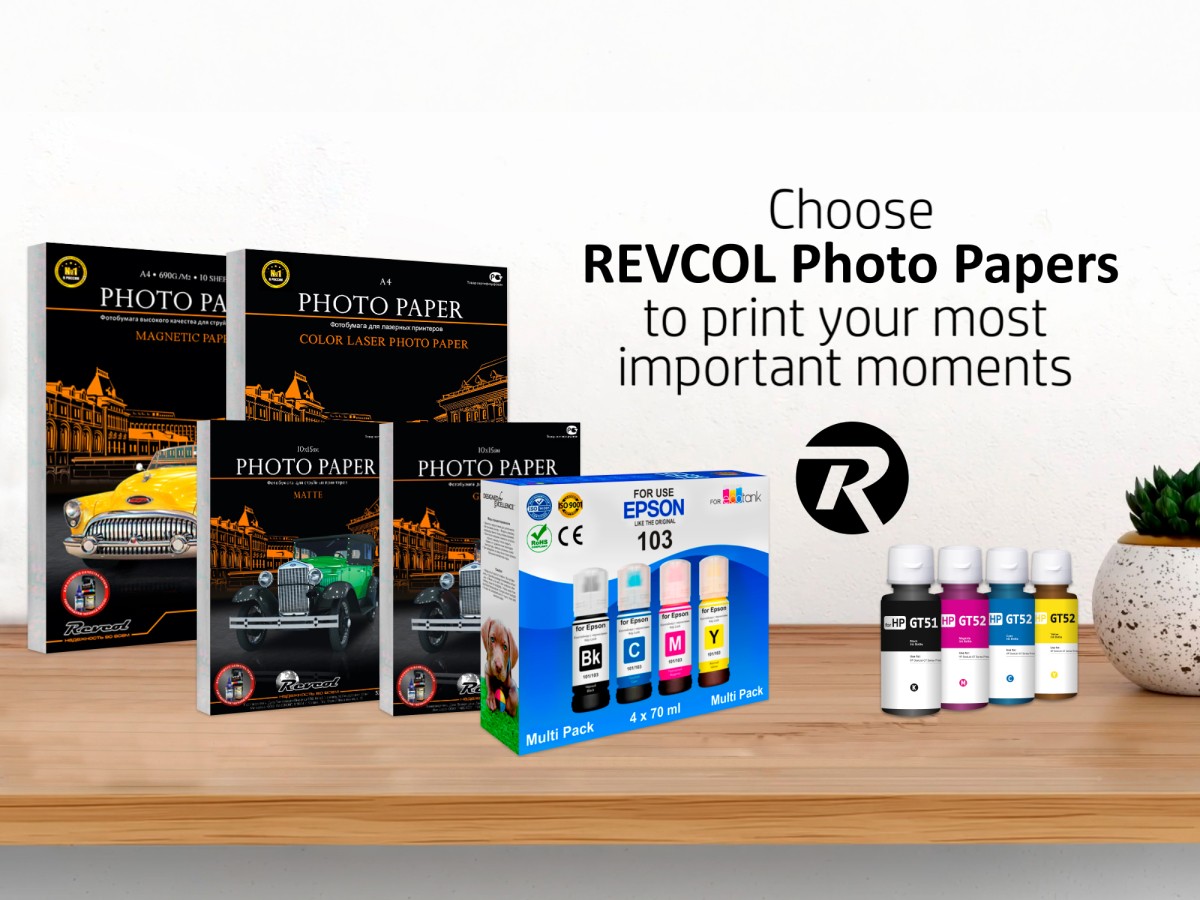 Ассортимент «Ревкол» на сегодняшний день включает фотобумагу различных типов и плотностей, чернила для струйной печати, пленку для ламинирования и расходные материалы для офиса и дома.