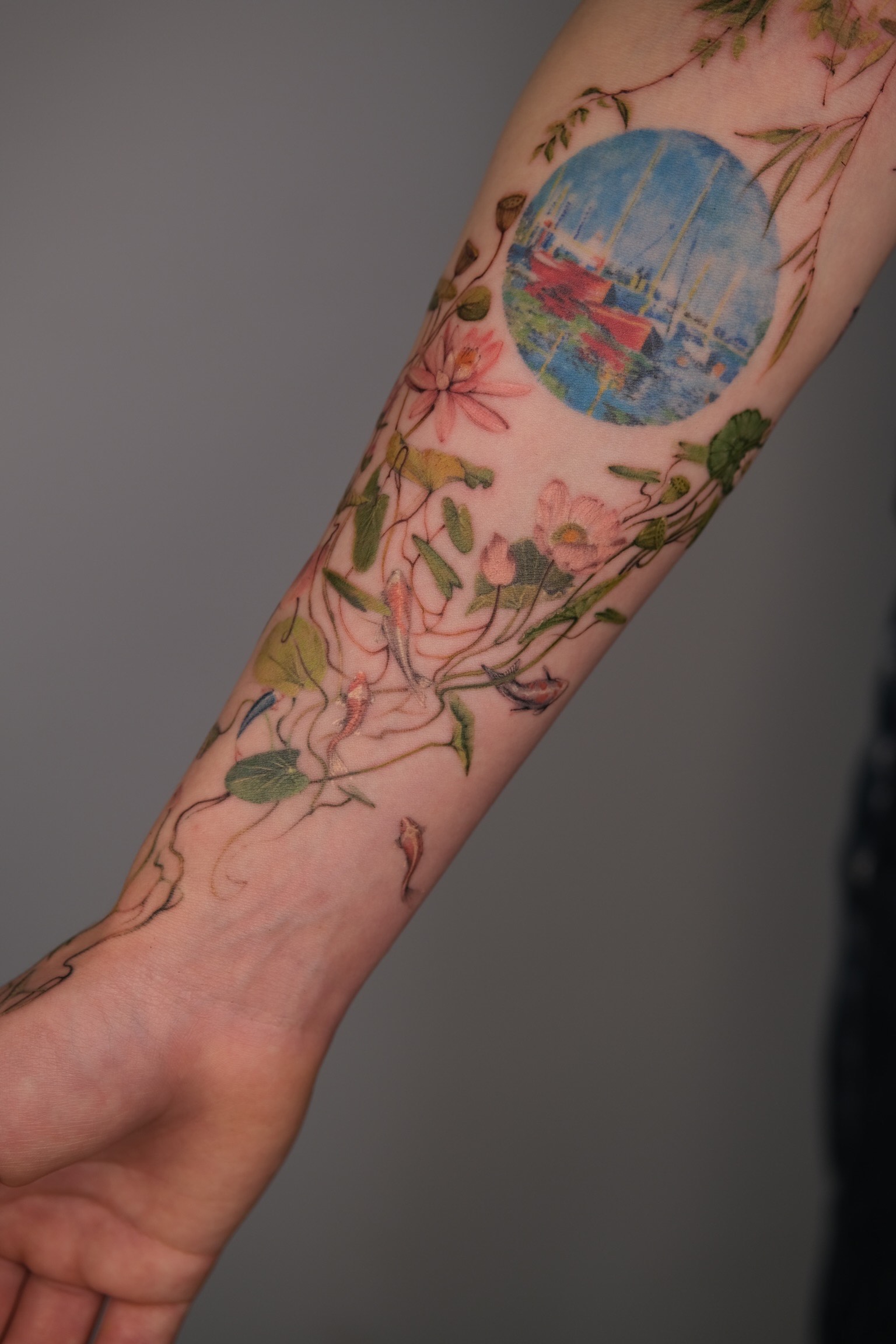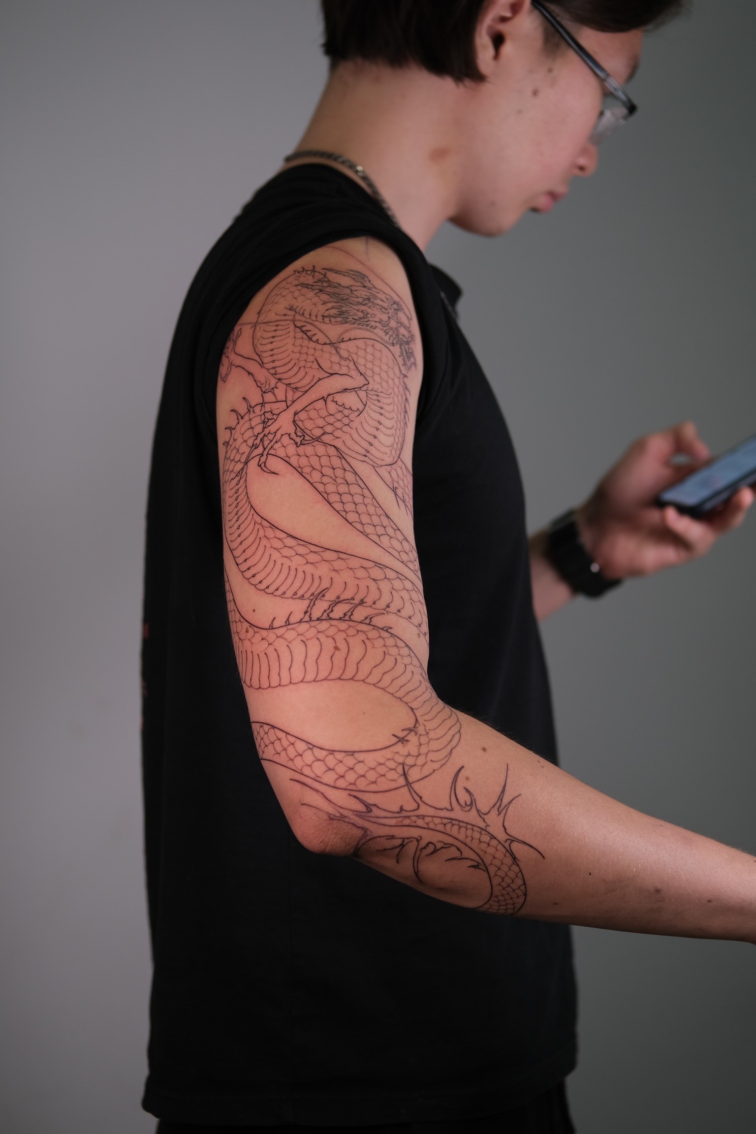 Первый раз увидела татуировку на незнакомом дедушке на пляже, решила для себя, что он прекрасен. Так и понеслось. Второе столкновение произошло на просторах вк тату пабликов, меня дико привлекали забитые полностью девушки, и я для себя четко решила ещё тогда, что обязательно сделаю так же. Я росла, мысль не уходила, но трансформировалась в желание встать с другой стороны, рисовать на коже, а не быть холстом. А пока я бездумно изрисовывала тетради по алгебре. Я училась спокойно и довольно легко, особого интереса не высказывая к наукам, разве что потешить эго иногда хотелось, зато все предложения «нарисовать плакаты, декорации и тд» принимала без раздумий, в результате брала работу домой и продолжала рисовать ночью.