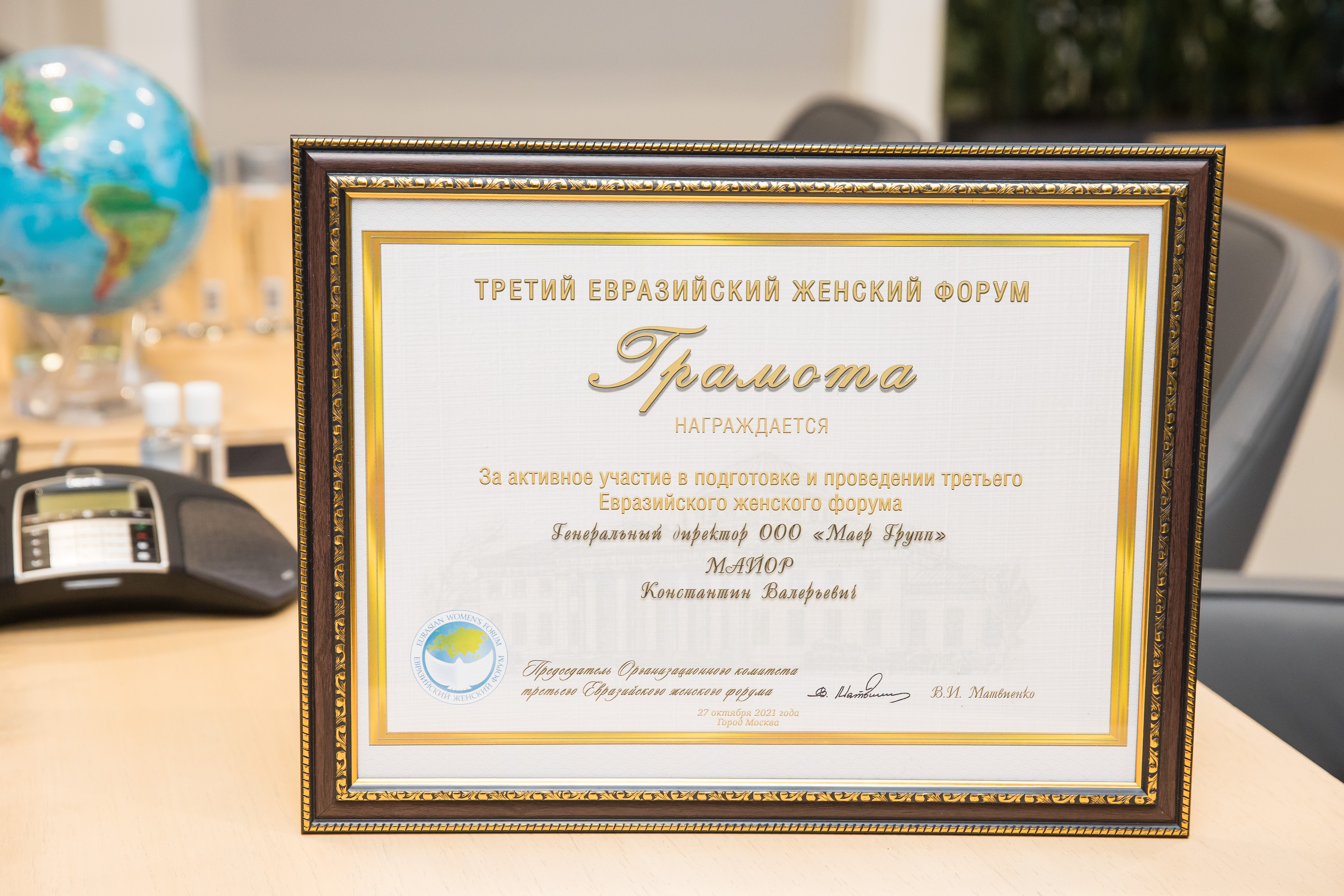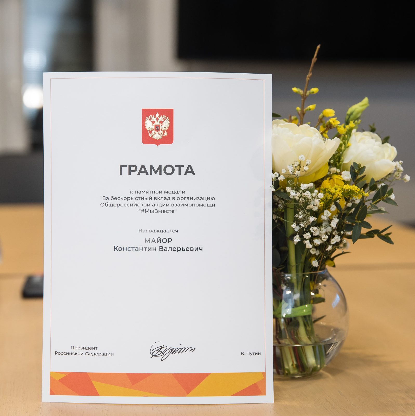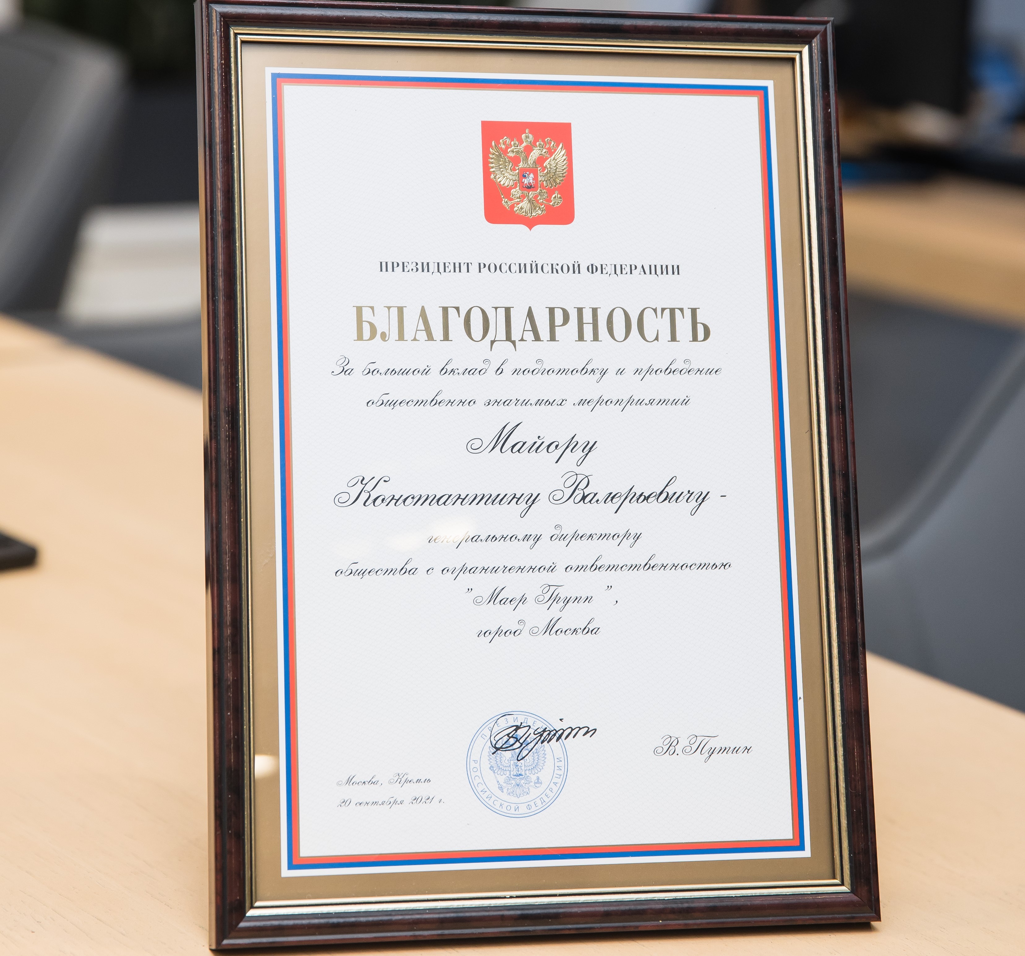 Благодарственная грамота президента России «За большой вклад в подготовку и проведение общественно значимых мероприятий».